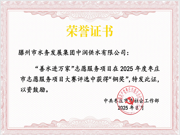 近日,棗莊市委社會(huì)工作部公布2025年度棗莊市志愿服務(wù)項(xiàng)目大賽獲獎(jiǎng)名單,市水務(wù)發(fā)展集團(tuán)中潤(rùn)供水有限公司推薦的“善水進(jìn)萬(wàn)家”志愿服務(wù)項(xiàng)目榮獲大賽“銅獎(jiǎng)”。