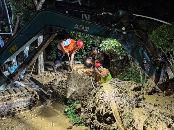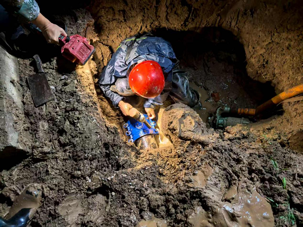 經(jīng)仔細(xì)勘查,搶修人員快速確定爆管位置,并制定周密搶修方案。夜間作業(yè)加之持續(xù)降雨,給搶修帶來諸多困難,但隊(duì)員們毫無退縮,迎難而上,在惡劣天氣與復(fù)雜環(huán)境中緊張操作,有序完成關(guān)閥止水、開挖作業(yè)坑、排水清淤、更換管件、焊接合攏等一系列操作。經(jīng)過4小時(shí)連續(xù)奮戰(zhàn),成功修復(fù)爆裂管道,小區(qū)供水恢復(fù)正常。
