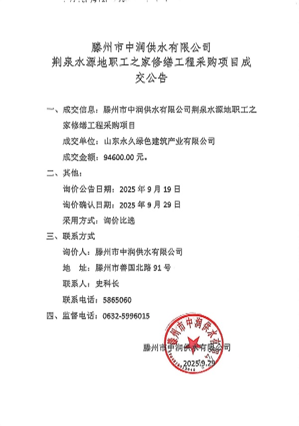 滕州市中潤供水有限公司荊泉水源地職工之家修繕工程采購項目成交公告