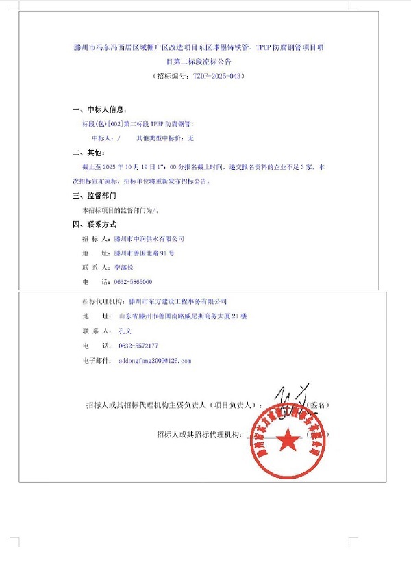 滕州市馮東馮西居區(qū)域棚戶區(qū)改造項(xiàng)目東區(qū)球墨鑄鐵管、TPEP防腐鋼管項(xiàng)目項(xiàng)目第二標(biāo)段流標(biāo)公告