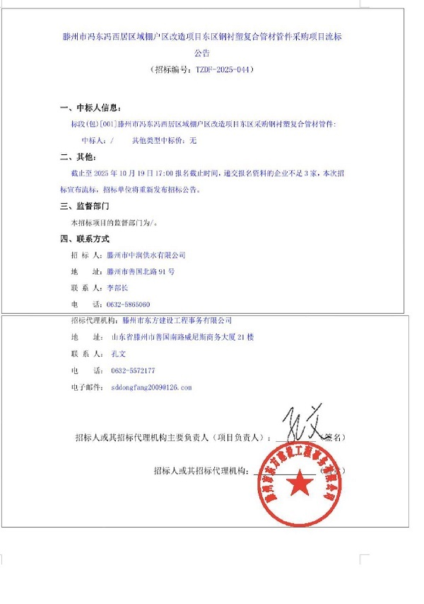 滕州市馮東馮西居區(qū)域棚戶區(qū)改造項(xiàng)目東區(qū)鋼襯塑復(fù)合管材管件采購項(xiàng)目流標(biāo)公告