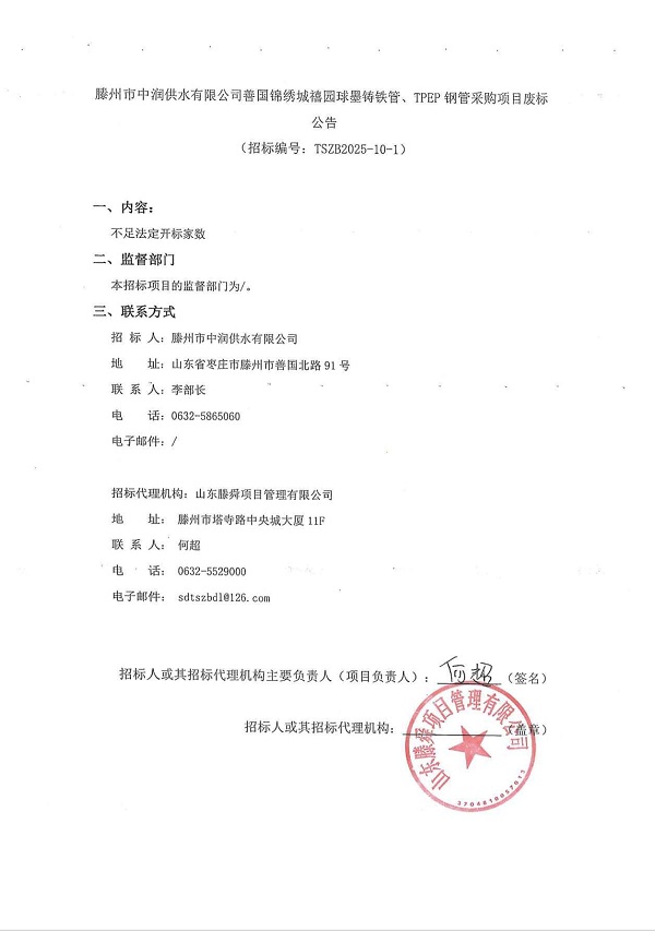 滕州市中潤(rùn)供水有限公司善國(guó)錦繡城禧園球墨鑄鐵管、TPEP鋼管采購項(xiàng)目廢標(biāo)公告